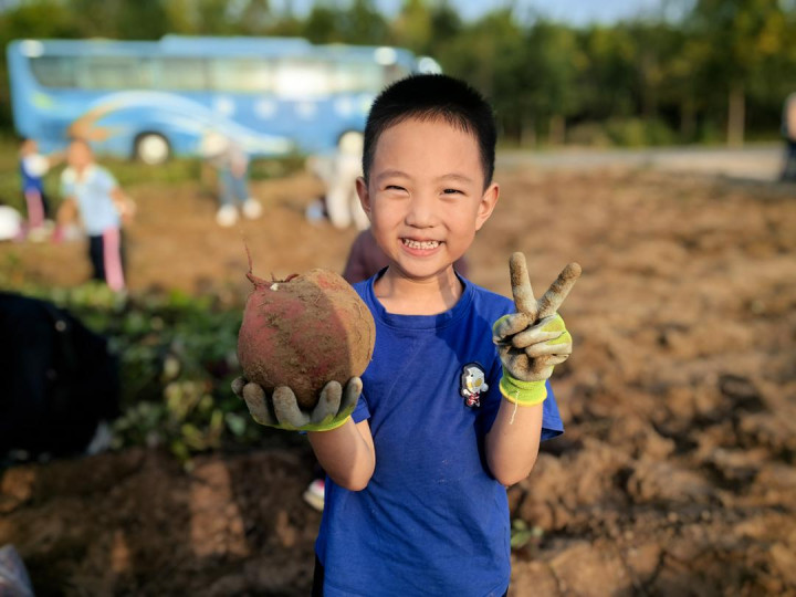 田间地头,孩子们化身“小农夫”,手持小铲,拨开泥土,亲手挖出胖乎乎的红薯;用力一拔,一串串花生破土而出,欢声笑语回荡在秋日的田野中。他们测量果实、称重比较,在劳动中感受数学的乐趣,还用红薯藤编织成手链、项链,创意满满。